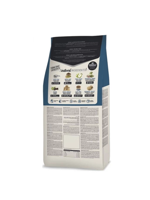 Viande déshydratée (18%), poisson 15% (poisson frais 10%, poisson déshydraté 5%), blé complet (12%), orge complet (12%), graisse de poulet, son de blé (9%), maïs complet (9%), riz complet (6%), petits pois entiers (3%), pomme fraîche (1%), huile de saumon, graines de lin (1%), pulpe de betterave, fructo-oligosaccharides et mannane-oligosaccharides, levure de bière (0,5%), herbes botaniques 0,02% (fenouil, échinacée, thym), extrait de yucca schidigera.