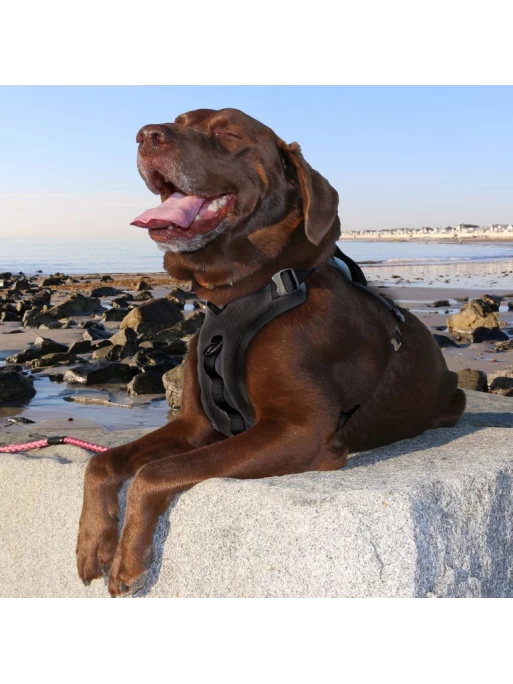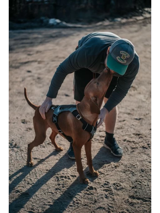 Le tissu extérieur est très résistant (Ripstop) et la partie interne est en tissu de type Mesh anti-transpirante. L’ensemble du harnais est matelassé et un renfort rembourré a été ajouté sur la partie avant du harnais (poitrail) pour encore plus de confort. Une poignée est intégrée sur la partie dorsale pour extraire ou aider le chien sur des obstacles. Le harnais possède 4 points de réglage pour s’ajuster au mieux à la morphologie de chaque chien. Il est possible de fixer la laisse au niveau du dos ou du poitrail du chien. Toutes les attaches et fixations sont en aluminium léger et ont un traitement antirouille.
