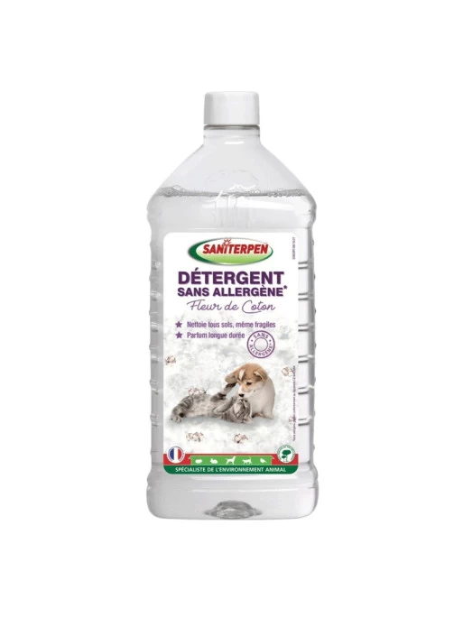 Le saniterpen du00e9tergent supprime les mauvaises odeurs et diffuse durablement un parfum de fleur de coton. Ce parfums est ru00e9manent et raffinu00e9. Il est tru00e8s bien tolu00e9ru00e9s par les animaux.