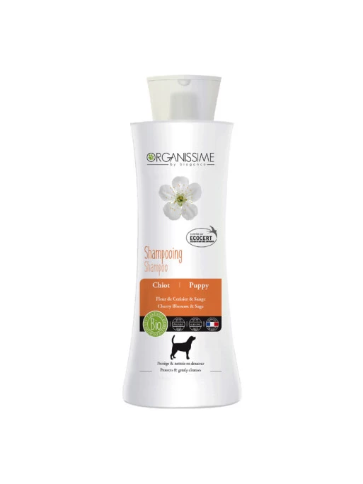 Formulu00e9 u00e0 base d’huile essentielle de Sauge et d’extrait de Fleur de Cerisier, le shampoing Chiots Organissime by Biogarance est spu00e9cialement conu00e7u pour s’adapter aux pelages des jeunes chiens.