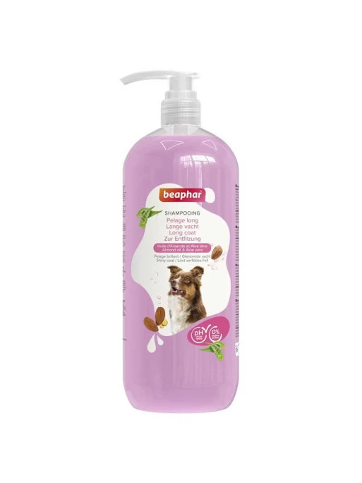 Pour les chiens u00e0 poil long, le shampoing Essentiel 1L Beaphar u00e0 base d’Aloe Vera et d’huile d’amande nourrit le poil en profondeur, de la racine u00e0 la pointe, tout en laissant une odeur agru00e9able.